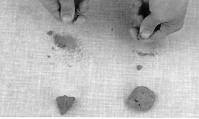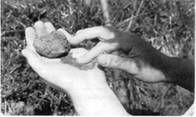 Steine über 1 cm werden aus einer Probe ausgelesen und der erdfeuchte Lehm mit den Händen zu ca. 5 cm Durchmesser dicken Kugeln geformt. Klebt der Lehm beim formen an den Händen, so ist er zu fett, fällt die Kugel gleich oder nach kurzer Zeit auseinander, so ist er zu mager. |