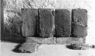 Man nimmt gebrannte Ziegelsteine und feuchtest sie mit Wasser an. Nun zieht man eine 2 cm dicke Schicht Baulehm auf und stellt den Stein dann senkrecht auf. Am geeignetsten ist die Lehmhaftprobe die 48 Stunden ( bei sehr hoher Luftfeuchtigkeit 1 Tag länger) am Ziegelstein haftet ohne Schwundrisse zu zeigen. |