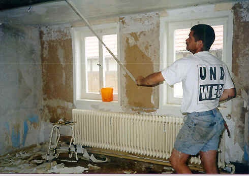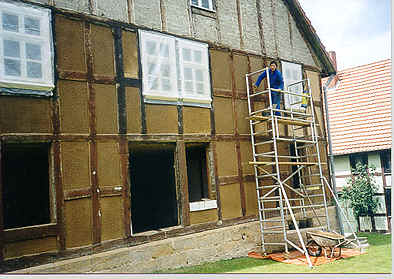 Endlich, endlich kamen wir ans Ausmauern der Außenwände. Natürlich mit Stroh-Lehm. Der Mai 2OOO war recht warm, windig und sonnig, so konnte der Lehm schön trocknen. Aber erst einmal musste er auf die Außenwände aufgebracht werden. Vor einem Jahr kamen mir die Eimer weniger schwer und meine Arme weniger lang vor. Aber die Zeit drängte und unser Tagewerk spornte uns an. Oft war unsere einzige Aktivität am Abend noch ein heißes Bad und der Weg ins Bett. Es kam auch vor, dass einer von uns mitten im Gespräch einschlief. Der Mai war für uns recht anstrengend aber auch sehr befriedigend. Als die erste Lehmschicht darauf war wurde das Ständerwerk sandgestrahlt und 5 mal gestrichen.
