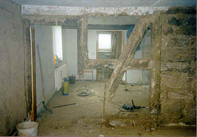 Wände wurden auf gestemmt, Deckenvertäfelungen abgehängt, Putz abgeschlagen und Balken freigelegt. So entdeckten wir auch, dass man als Isolierung zwischen Wohnung und Treppenhaus alte Matratzen benutzt hatten, in denen sich nun Nagetiere ein neues Zuhause gebaut hatten. Wir kündigten den unerwünschten Untermietern fristlos ,indem wir ihr Matratzenlager entsorgten und die Isolierung mit Strohlehm vornahmen.