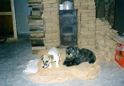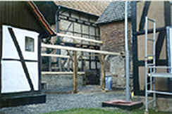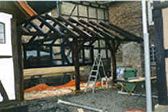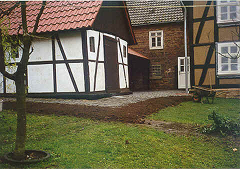 Der Winter2000 fing sehr mild an und so versuchten wir noch einige Arbeiten rund ums Haus zu erledigen. Ein neuer Unterstand und Freisitz für unsere Mieter sollte gebaut werden ( Wieder aufgebaut werden ) Ich glaube, das war die Zeit wo mein Mann auch endlich einmal wieder was fertig sehen wollte. So wurde aus alten Eichenbalken ein Unterstand gebaut, mit Rauschbund eine Überdachung gemacht und dann mit Pfannen belegt. Die Rückwand, als Windschutz gedacht, mit Haselruten gefochten und mit Lehm ausgemauert.