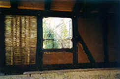 | Im Juni kam der erste Satz Fenster. Genau 11 Stück und unser Haus wurde fast ein Prachtstück. In unseren Augen alle mal. Die wunderschönen Fenster wurden zu- gehangen und abgeklebt und wieder kam eine Lehmschicht in die Gefache. Dank der Übungen im Mai fiel uns die zweite Schicht nicht mehr so schwer. Wahrscheinlich, weil sie etwas dünner war. Nun wurde verdichtet. | ![]() |