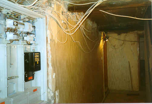| Da in ganzen Haus die Stromkabel überlastet und für die heutigen Anforderungen unzulässig waren beschlossen wir einen Verteilerkeller einzurichten. Von diesem Raum sollte später Wasser, Heizung und Strom für das ganze Haus verteilt werden. Daher entfernte mein Mann mit einer Elektrofirma die Stromkästen aus dem Treppenhaus und brachten neue Kästen in einem extra dafür errichteten Kellerraum an. Durch diese Aktion ergab sich eine neue „Baustelle“ das Treppenhaus. | ![]() |
