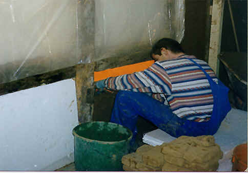 Aber schon als wir die Tapeten ablösten, konnten wir nur wirren Untergrund erkennen. Mal war es Lehm, mal Sauerkrautplatten, mal Verlegerplatten und auch an einigen Stellen einfach bröckelnder Putz. Im Bad war es eine starke Wand die uns Sorgen bereitete. Sie war so ganz anders als alles bis jetzt entdeckte. Vorsichtig lösten wir die Steine aus und sahen dann eine zweite Wand. Man hatte einfach eine Mauer vor die Außenwand gesetzt. Aber warum? ! Als wir uns die neu entdeckte Außenwand genauer betrachteten wussten wir es. Selbst ein 3 jähriges Kind hätte ohne Mühe die Wand herausstoßen können. Da diese Stelle keine Zimmermanns Arbeiten erforderten lösten wir alle Steine aus und erneuerten sie mit unserem geliebten Lehm. Nachdem nun alle Klarheiten beseitigt waren stellte sich die Frage wie die Isolierung vorgenommen werden sollte. Lattung mit Styropor, Sauerkrautplatten, Einmannverlegerplatten, oder alles mit Lehm zu schmieren. |